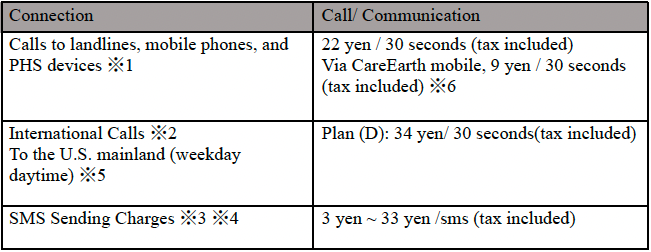 ※1 This section primarily describes call charges and communication fees. Please refer to the Terms and Conditions for detailed information. ※2 The international call rates above apply to daytime calls on weekdays to the United States (mainland) and vary depending on the destination country and time zone. For further details, please refer to the "Terms of Use for International Telephone Services."